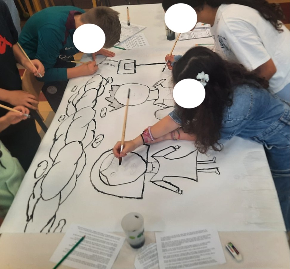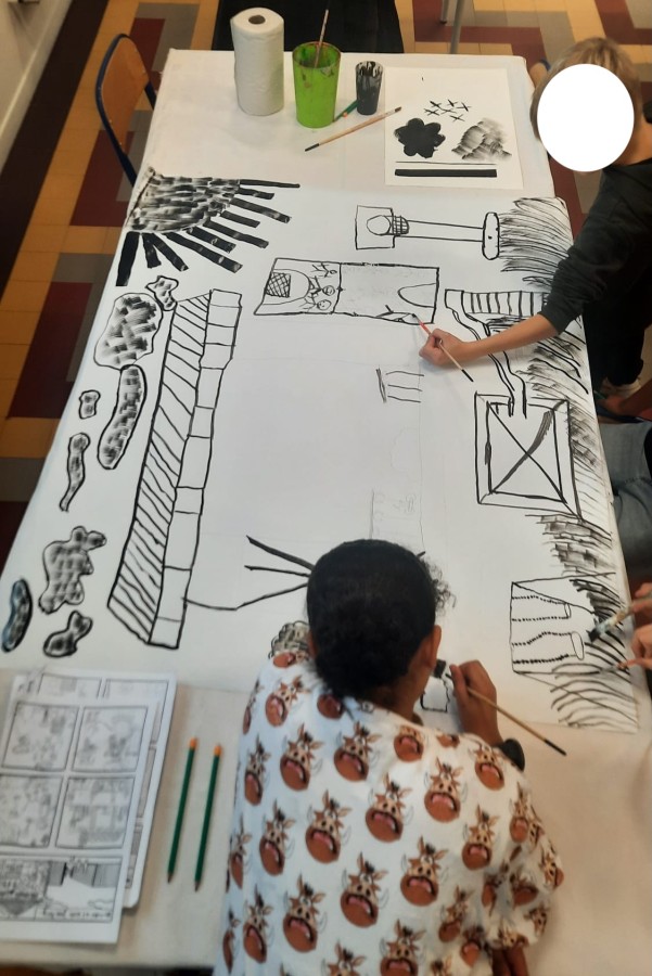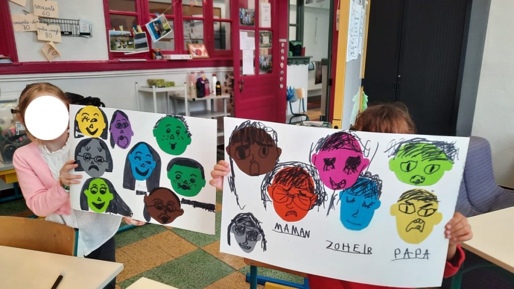 Les ateliers créatifs ont eu lieu pendant le mois d’octobre et novembre 2025. Nous avons exploré les différentes techniques du street-art : collage, peinture, pochoir, illustration… Pendant les séances les élèves ont réalisé des portraits de leurs camarades, illustré des émotions et composé une bande dessinée géante.